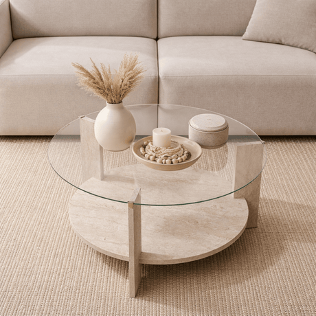 CHF 232.00Eenheid prijs /Niet beschikbaarRonde salontafel travertin melamine transparant glas Ø75 cm - Cairo