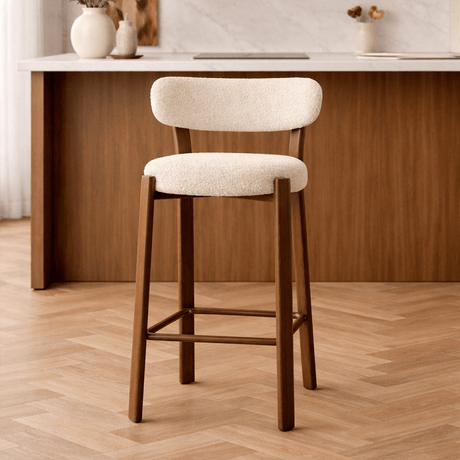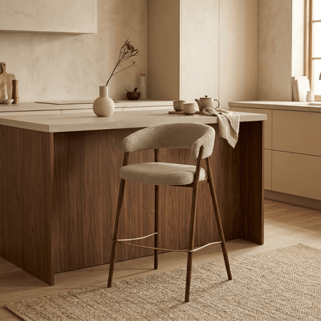 CHF 156.00Eenheid prijs /Niet beschikbaarBarstoel bouclé zandkleur Aiko - walnootlook frame - Japandi
