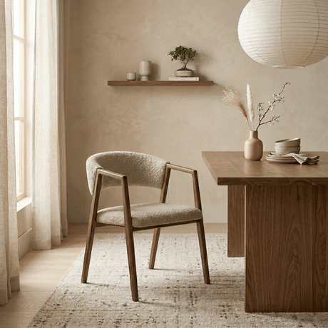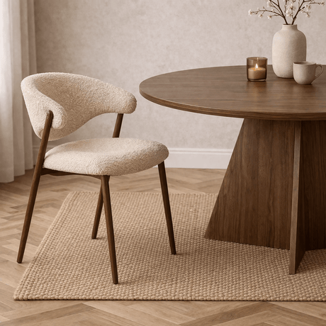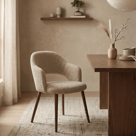 CHF 140.00Eenheid prijs /Niet beschikbaarEetkamerstoel bouclé zandkleur Aiko - walnootlook frame - Japandi