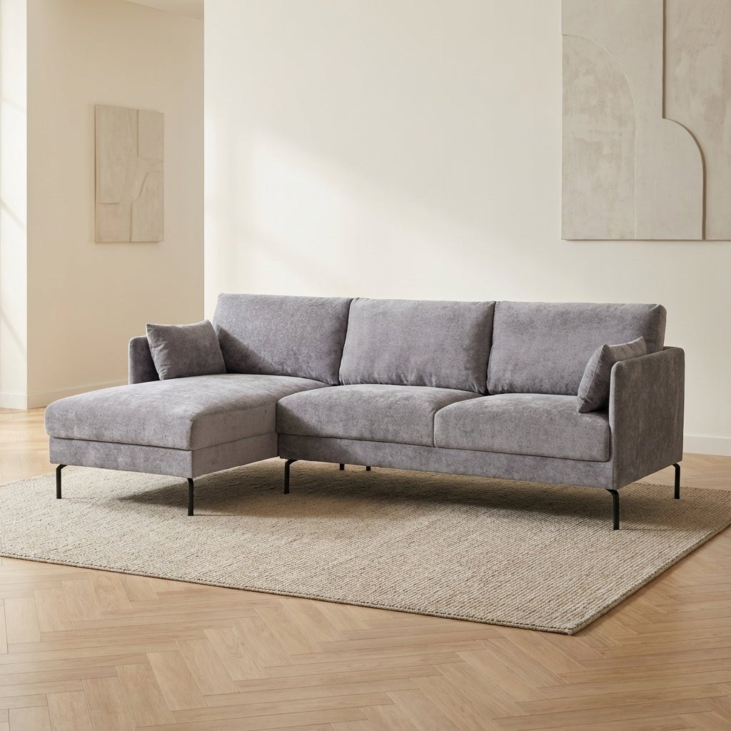 De hoekbank heeft een chique en eigentijdse uitstraling dankzij de velvet look van de stof en de zwarte metalen pootjes. De losse kussens zorgen voor extra comfort en geven de bank een speelse uitstraling maar blijven wel stevig op hun plaats zitten dankzij de klittenbandrand aan de onderkant. Het unieke aan de Lana hoekbank is dat de chaise longue naar wens zowel links als rechts geplaatst kan worden, waardoor je de indeling van je woonkamer gemakkelijk kunt aanpassen.