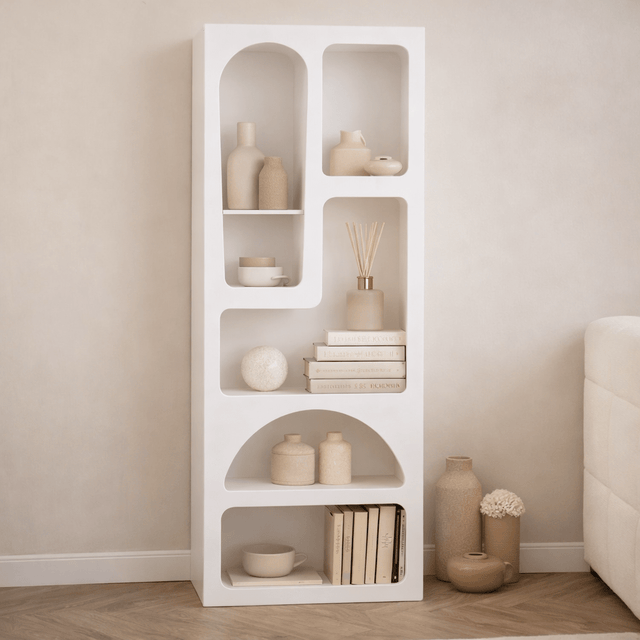 Geef je interieur een stijlvolle upgrade met deze unieke, sculpturale boekenkast. Ben je op zoek naar een kast die anders is dan standaard? Deze witte vakkenkast combineert strakke lijnen met zachte, organische bogen en ronde vormen. Geïnspireerd op de populaire Japandi- en minimalistische woonstijl, biedt deze kast plek voor je favoriete boeken, vazen en decoratie.