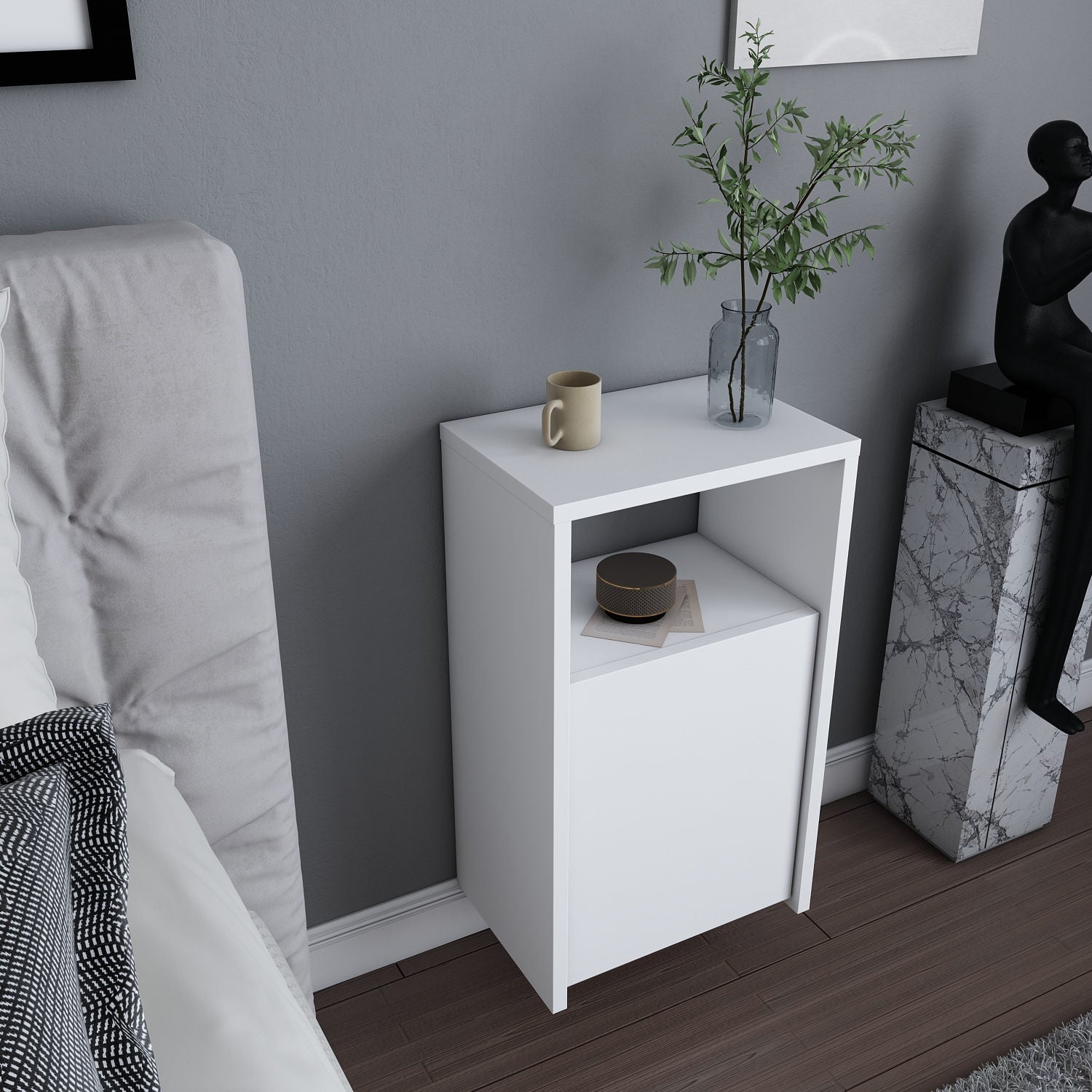 Carlin nachtkastje wit 36 cm Melamine gecoat houtcomposiet . Dit slanke model geeft je precies de opbergruimte die je naast je bed nodig hebt, zonder dat de kamer vol oogt. Ideaal voor je boek, oplader en een sfeerlamp, zodat je avondroutine netjes en ontspannen blijft.