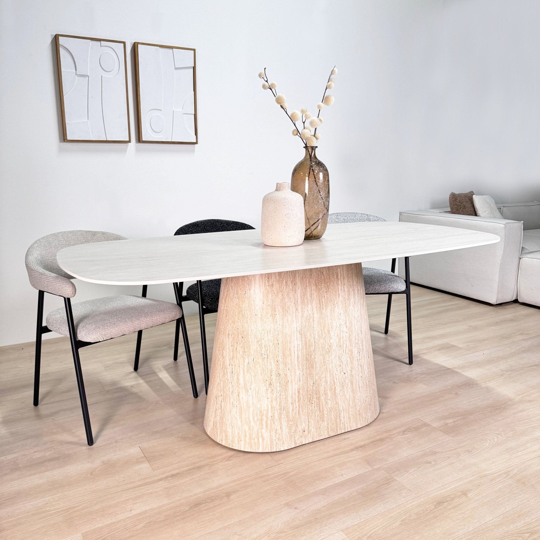 Deze prachtige Deens ovale eettafel combineert een licht blad van sintered stone met marmerlook en subtiele travertine details. De zachte nerfstructuur geeft het blad een luxe, chique uitstraling, terwijl het warme onderstel van travertine look zorgt voor harmonie.