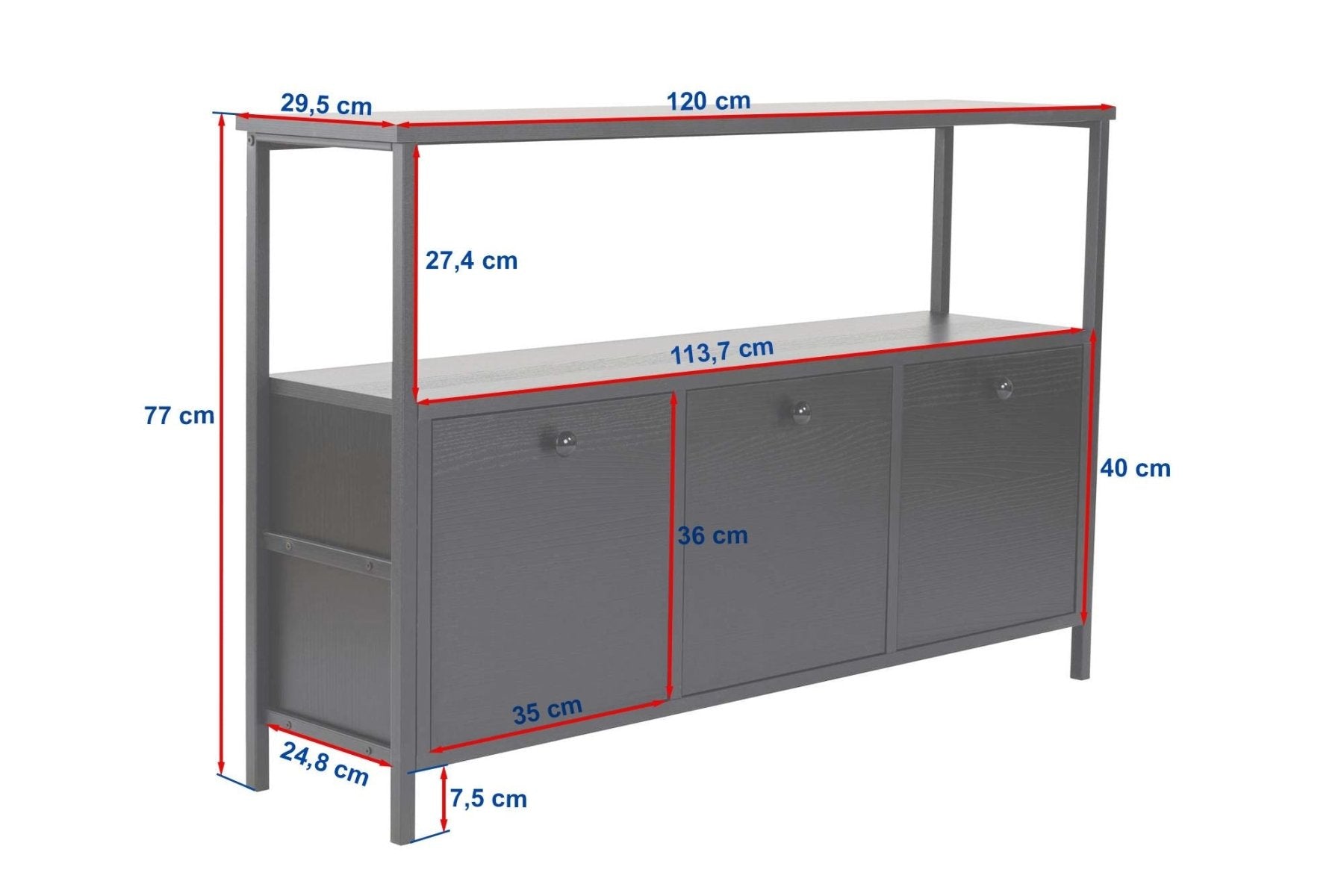 Beschrijving en specificaties van Dressoir Atlantisch Dennenhout Saloce - Zwart Frame - Drie Vakken - 120x77 cm