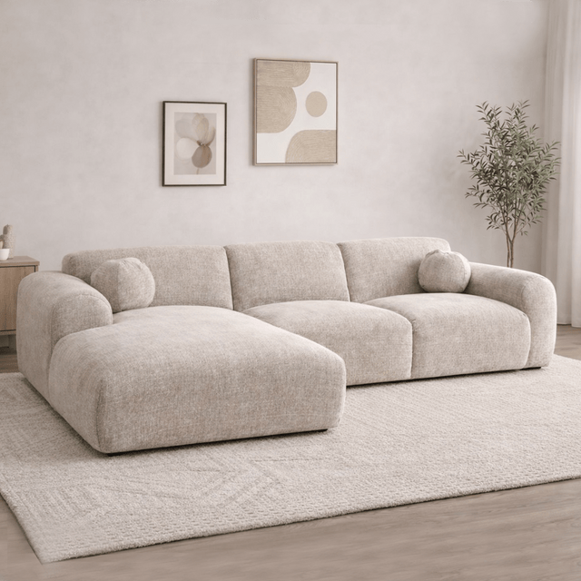 Beschrijving en specificaties van Hoekbank met lounge beige chenille stof Shane - links
