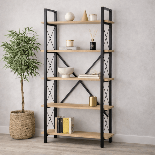 Beschrijving en specificaties van Industriële Boekenkast Ely Eiken Melamine - Zwart Frame - 180x90 cm