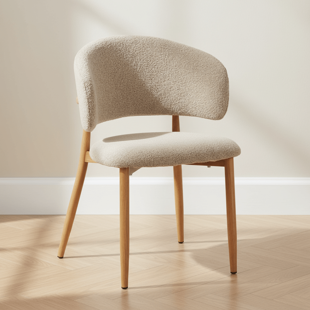 De Yuka eetkamerstoel is bekleed met een luxe bouclé stof, bekend om haar warme, wollige uitstraling en zachte structuur. De poten zijn gemaakt van metaal en afgewerkt met een realistische eiken houtlook, waardoor de stoel de perfecte balans biedt tussen stijl en stevigheid. De combinatie van zachte stof en natuurlijke tinten zorgt voor een tijdloze look.