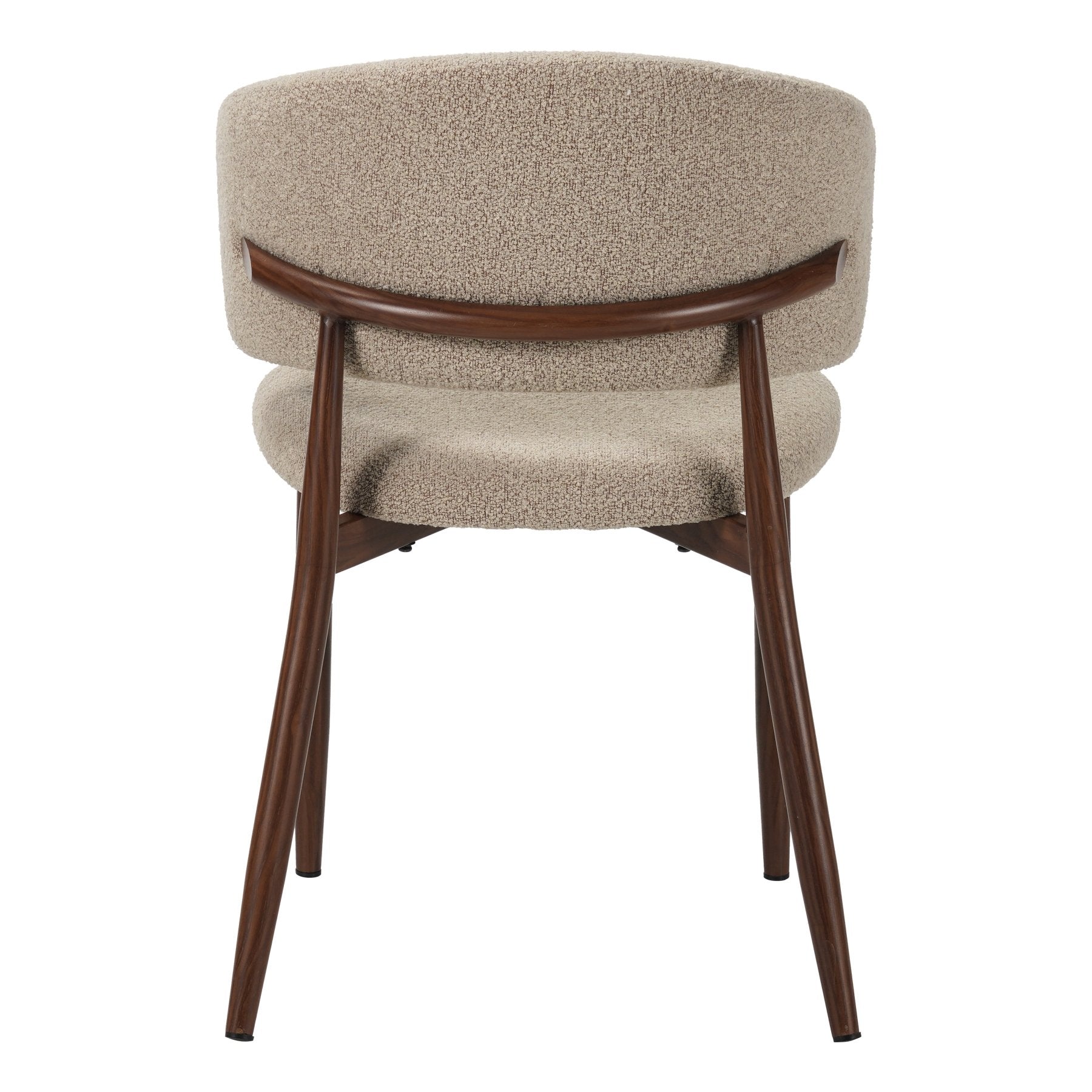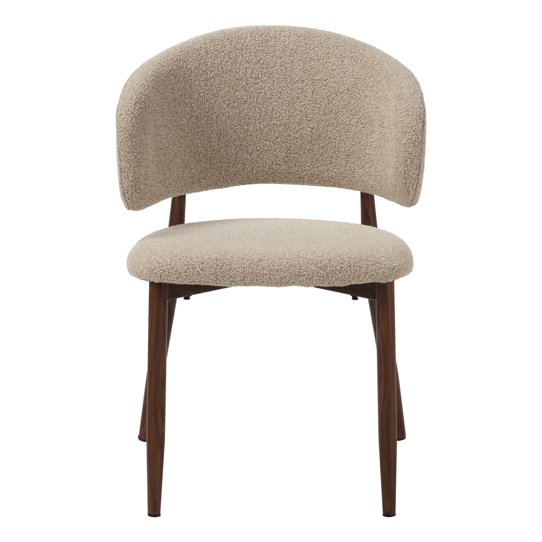 De Yuka eetkamerstoel is bekleed met een luxe bouclé stof, bekend om haar warme, wollige uitstraling en zachte structuur. De poten zijn gemaakt van metaal en afgewerkt met een realistische walnoot houtlook, waardoor de stoel de perfecte balans biedt tussen stijl en stevigheid. De combinatie van zachte stof en natuurlijke tinten zorgt voor een tijdloze look.