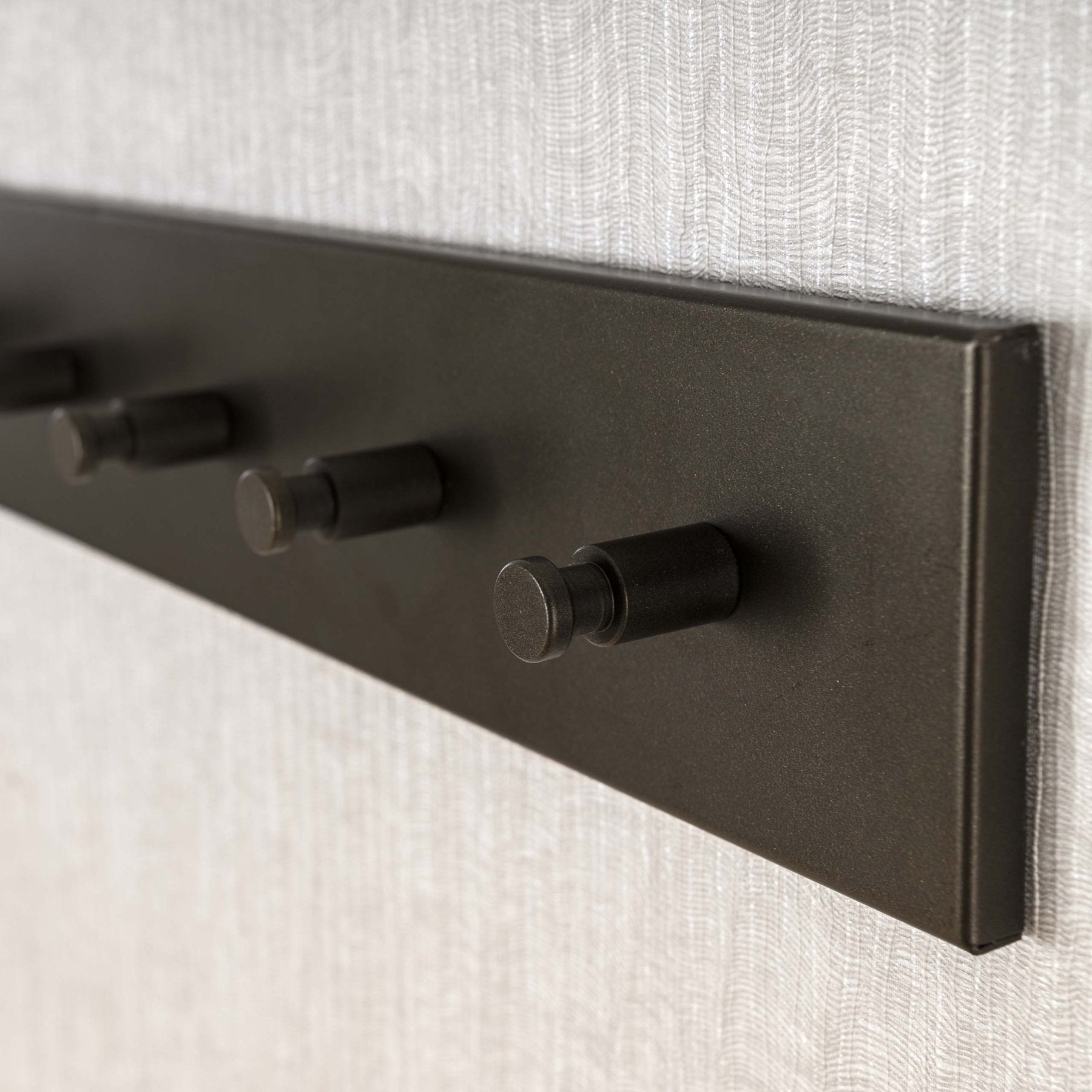 Deze Kapstok Aria met 8 haken combineert een slank profiel met robuuste functionaliteit. De warme zwart bronskleurige afwerking geeft een natuurlijke, tijdloze uitstraling en past goed in zowel moderne als klassieke interieurs. Dankzij de smalle diepte van 5 cm en de breedte van 80 cm is deze kapstok ideaal voor kleine halletjes, appartementen en gangen waar ruimtebesparing belangrijk is.