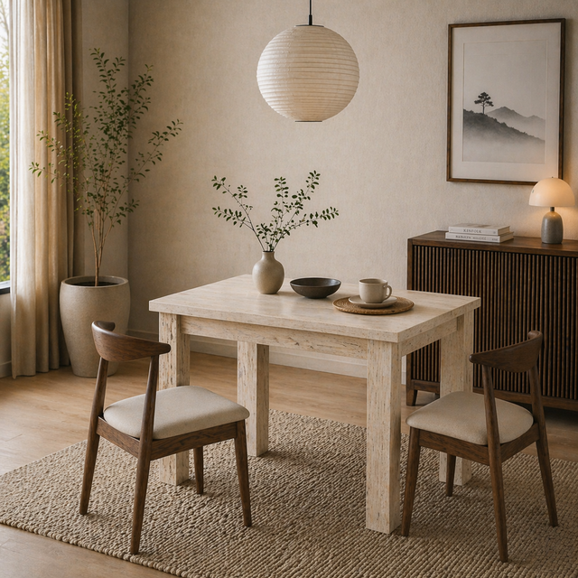 Beschrijving en specificaties van Kleine eettafel Travertin Melamine - 110 cm - met opbergruimte - Kara