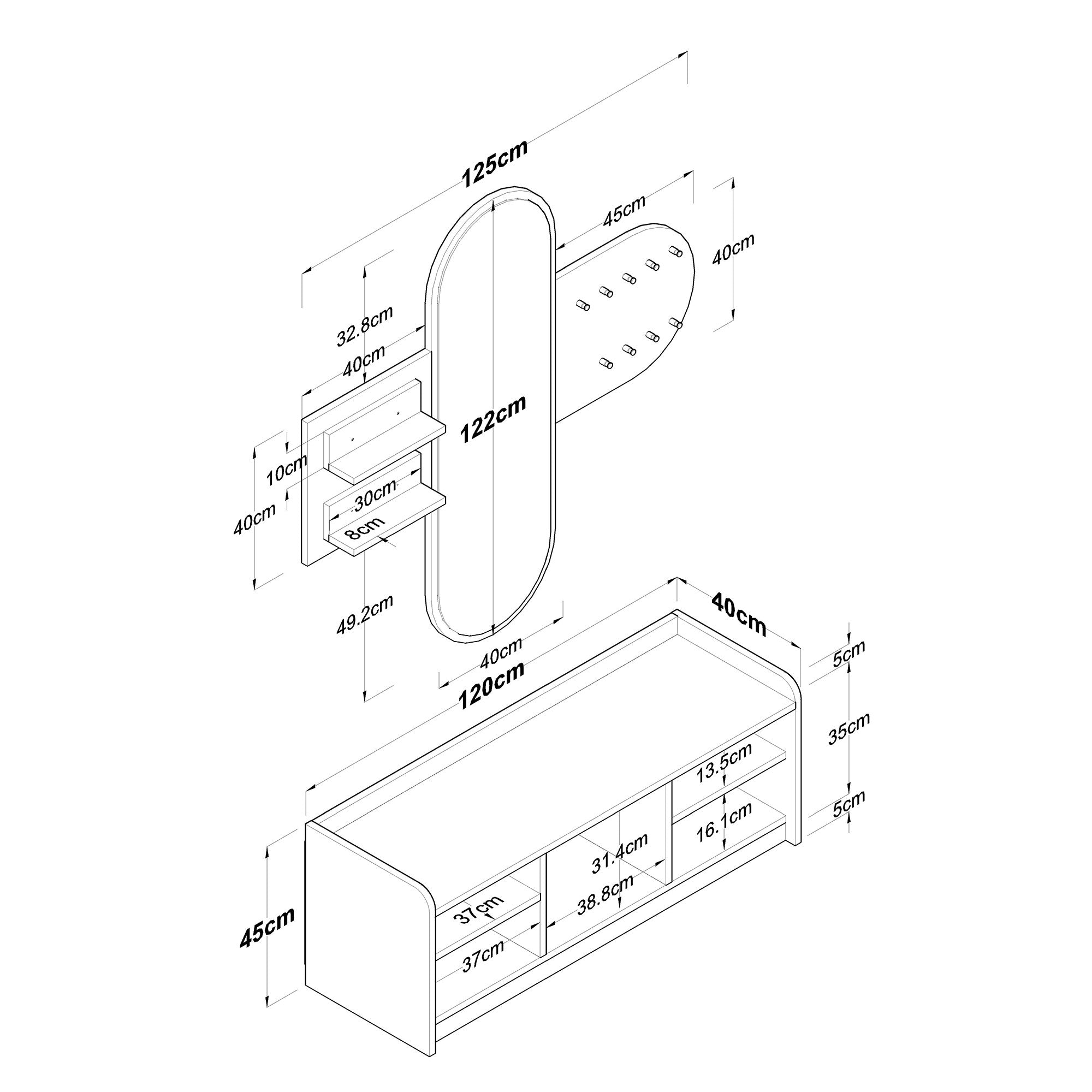 Beschrijving en specificaties van Meubelset Kapstok - Spiegel - Schoenenkast - Wit-Walnoot Melamine