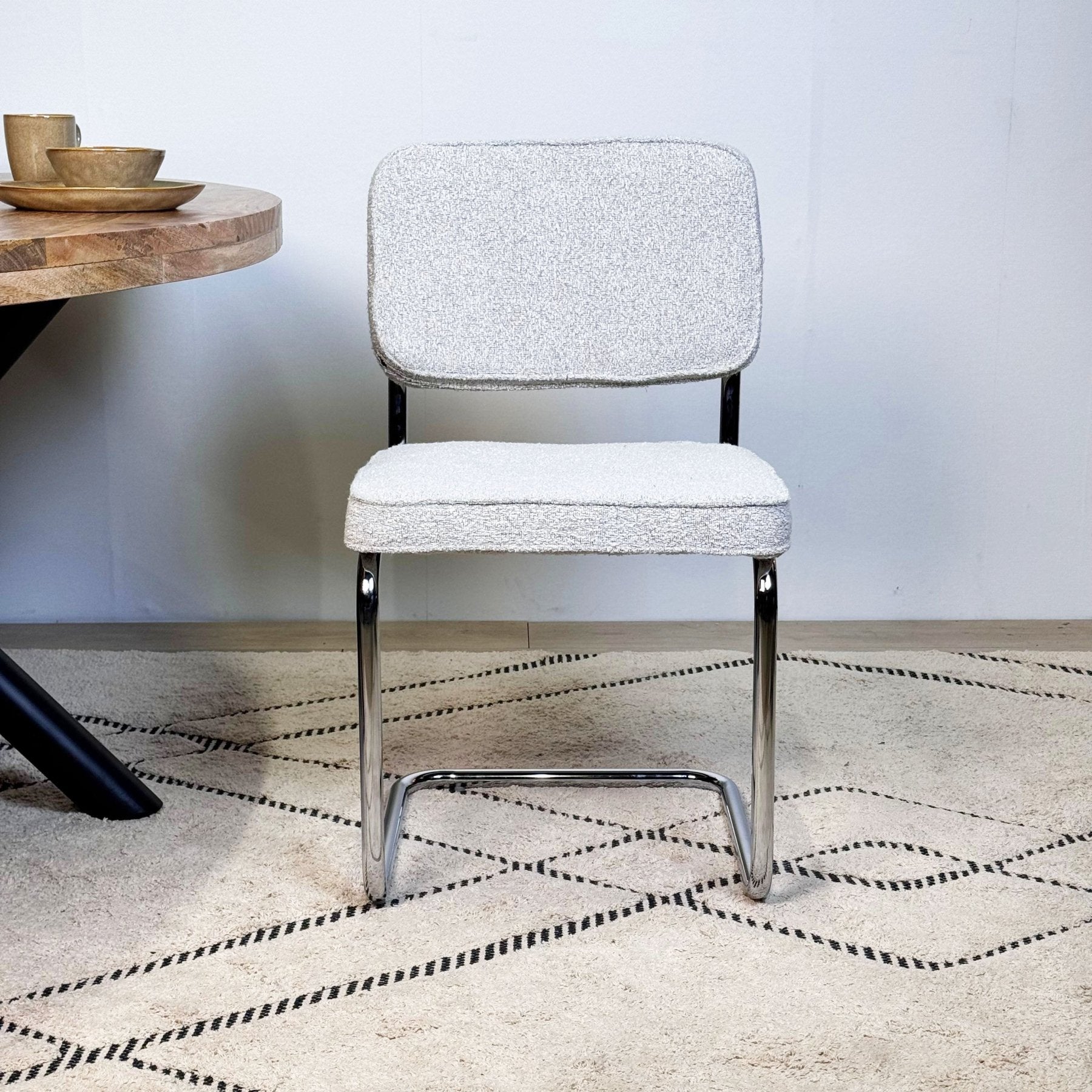De Sway Eetkamerstoel combineert een stijlvol chroom frame met een zachte bouclé stof, wat zorgt voor een eigentijdse uitstraling in elke eetkamer of keuken. Verkrijgbaar in diverse kleuren, sluit deze moderne eetkamerstoel perfect aan bij uiteenlopende interieurstijlen, van Scandinavisch, tot Retro, tot industrieel.