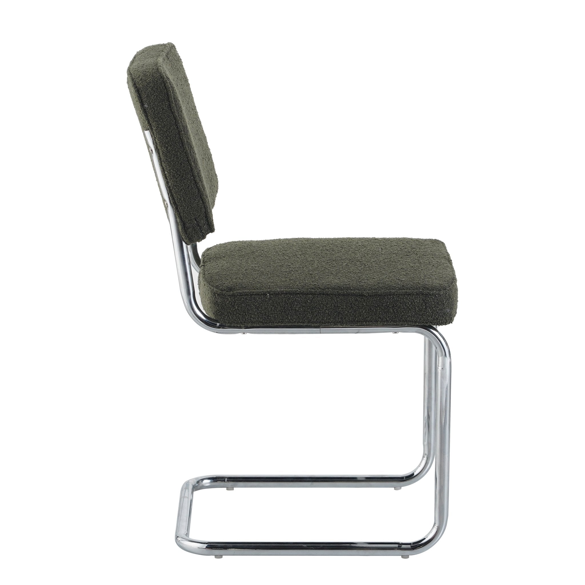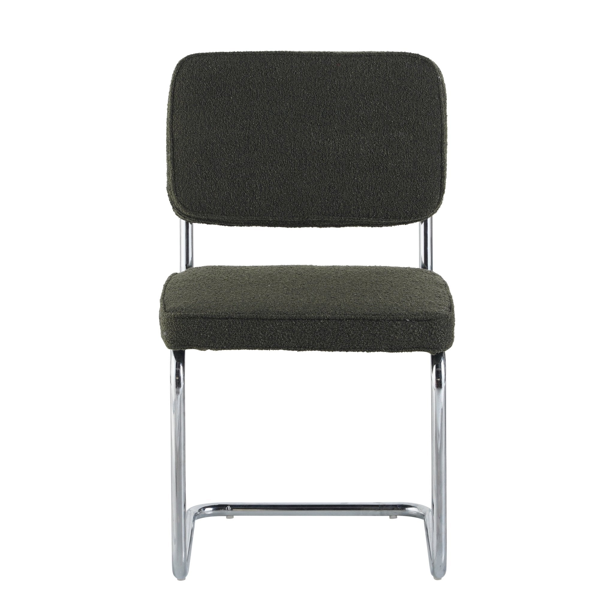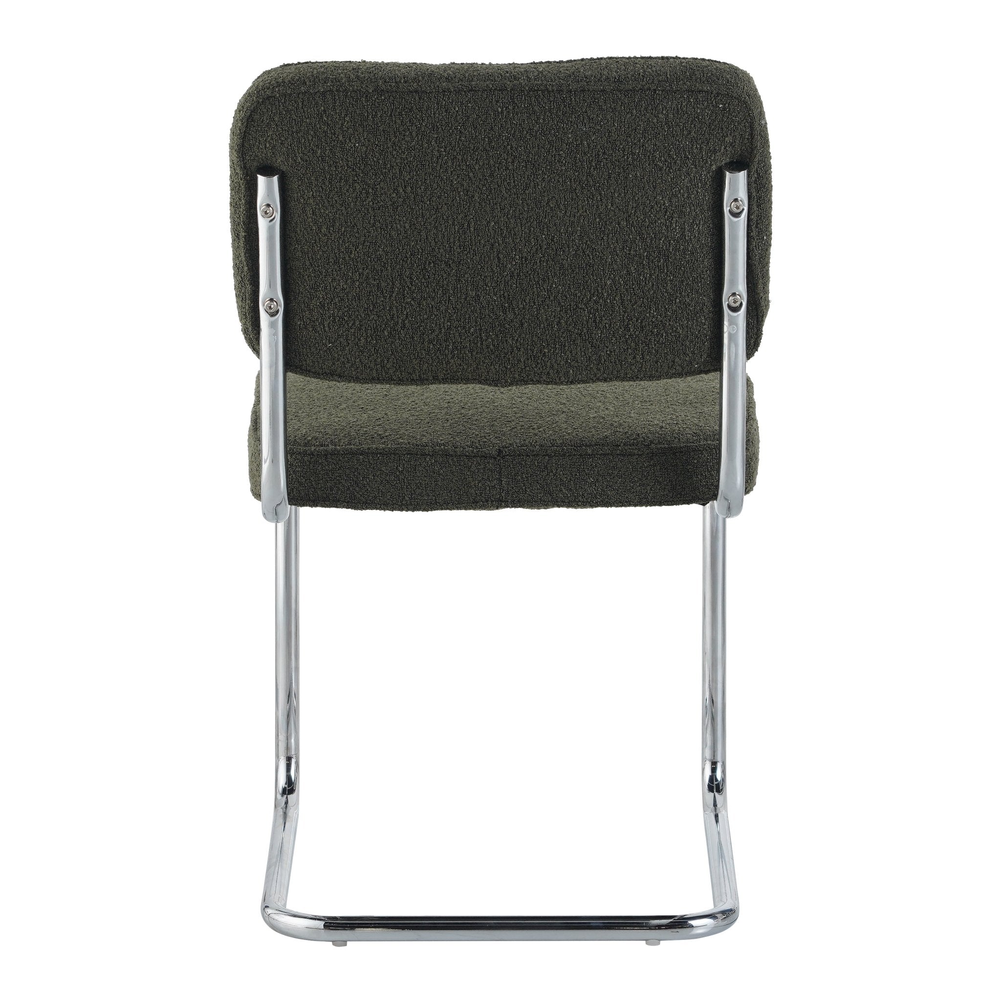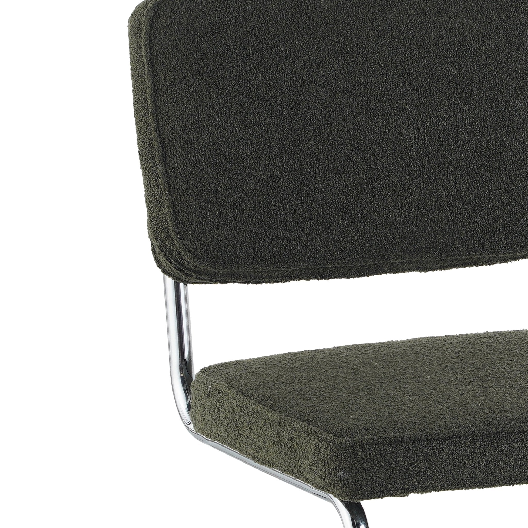 Beschrijving en specificaties van Moderne Eetkamerstoel Groen Bouclé Stof Sway - Chrome Frame - Zonder Armleuningen