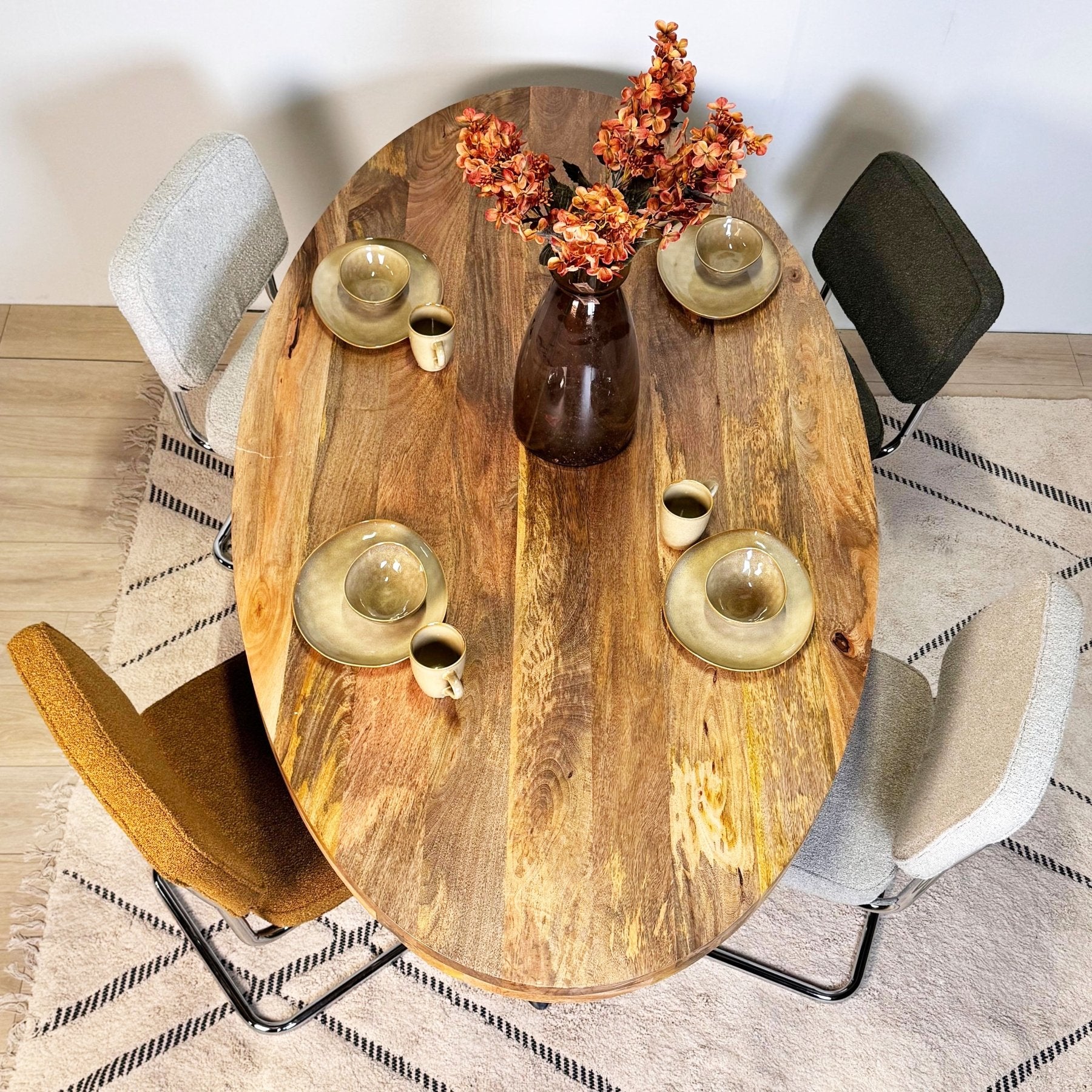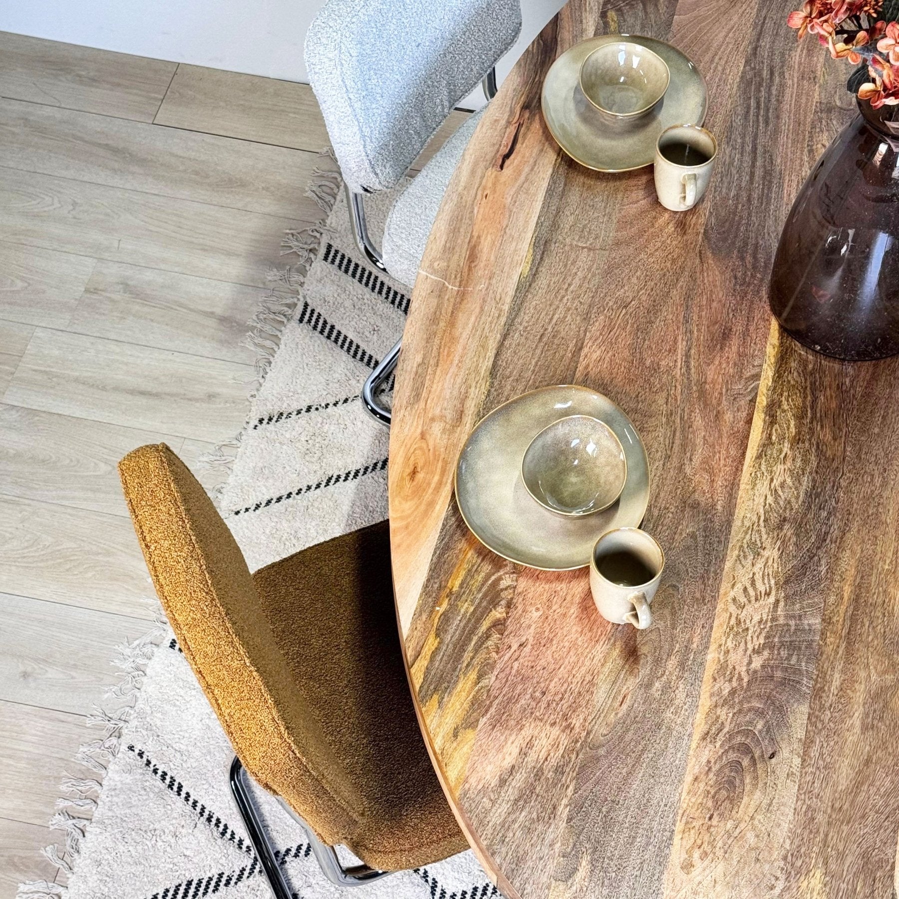 - Bouclé stof: Zacht, luxe en opvallend textuur, ideaal voor een cozy sfeer