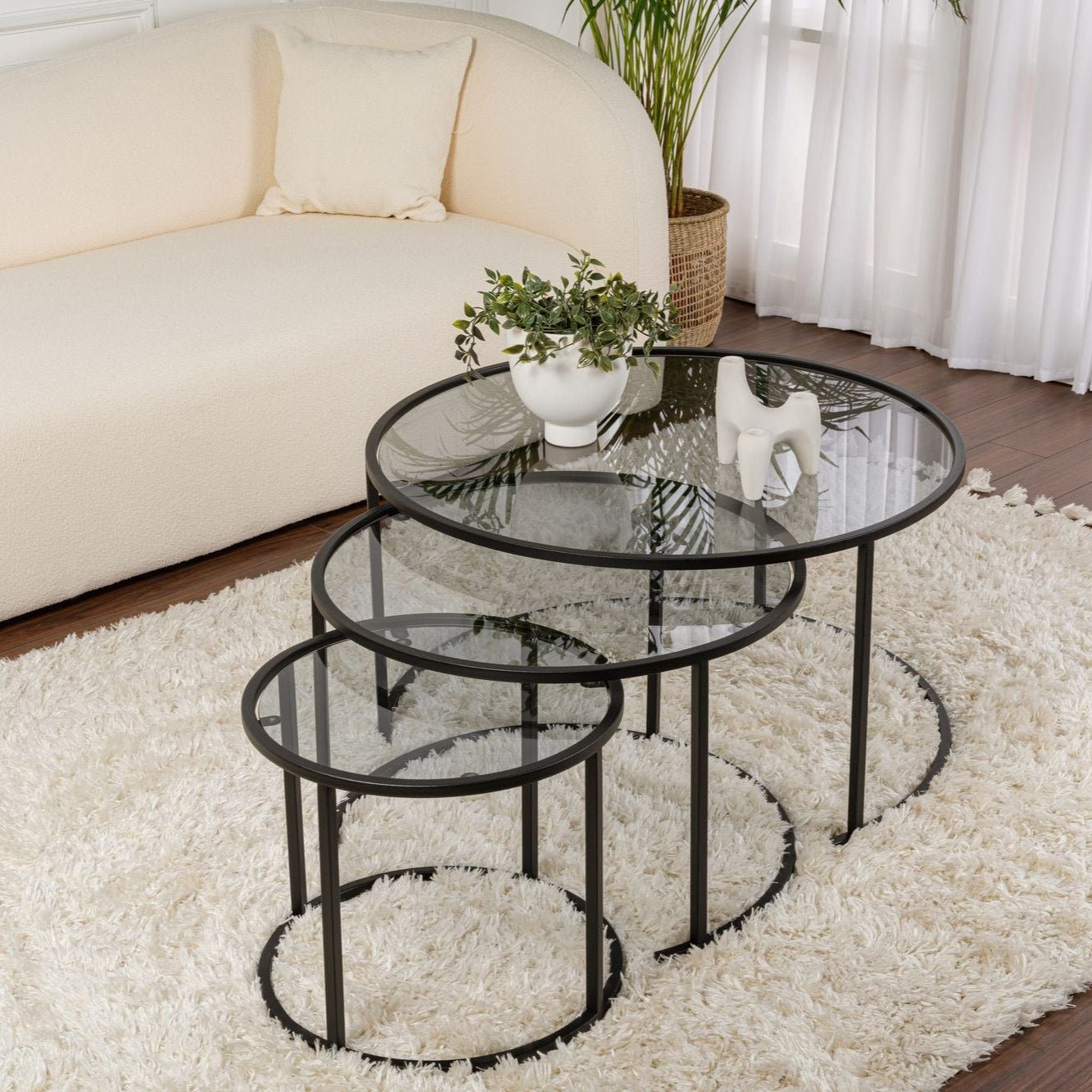 Beschrijving en specificaties van Moderne Salontafel Set van 3 Uru Zwart - Grijs Glas - 80/60/42 cm