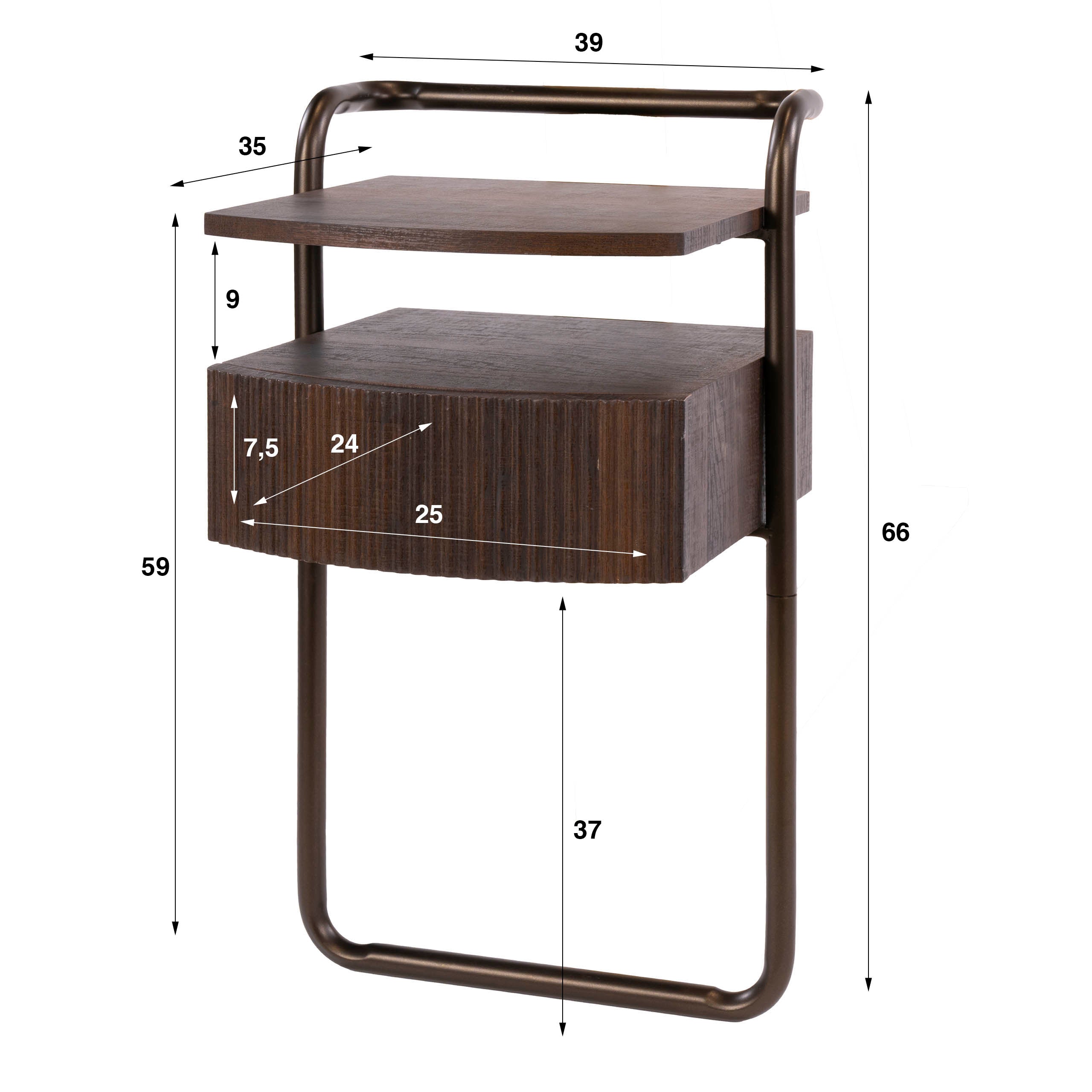 Beschrijving en specificaties van Nachtkastje met 1 lade donkerbruin hout brons frame Blaze