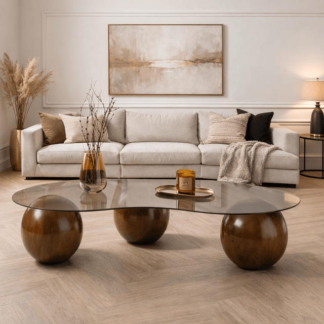 Organische salontafel grijs getint glas walnoot bolpoten Sphere 120x70 cm
