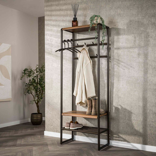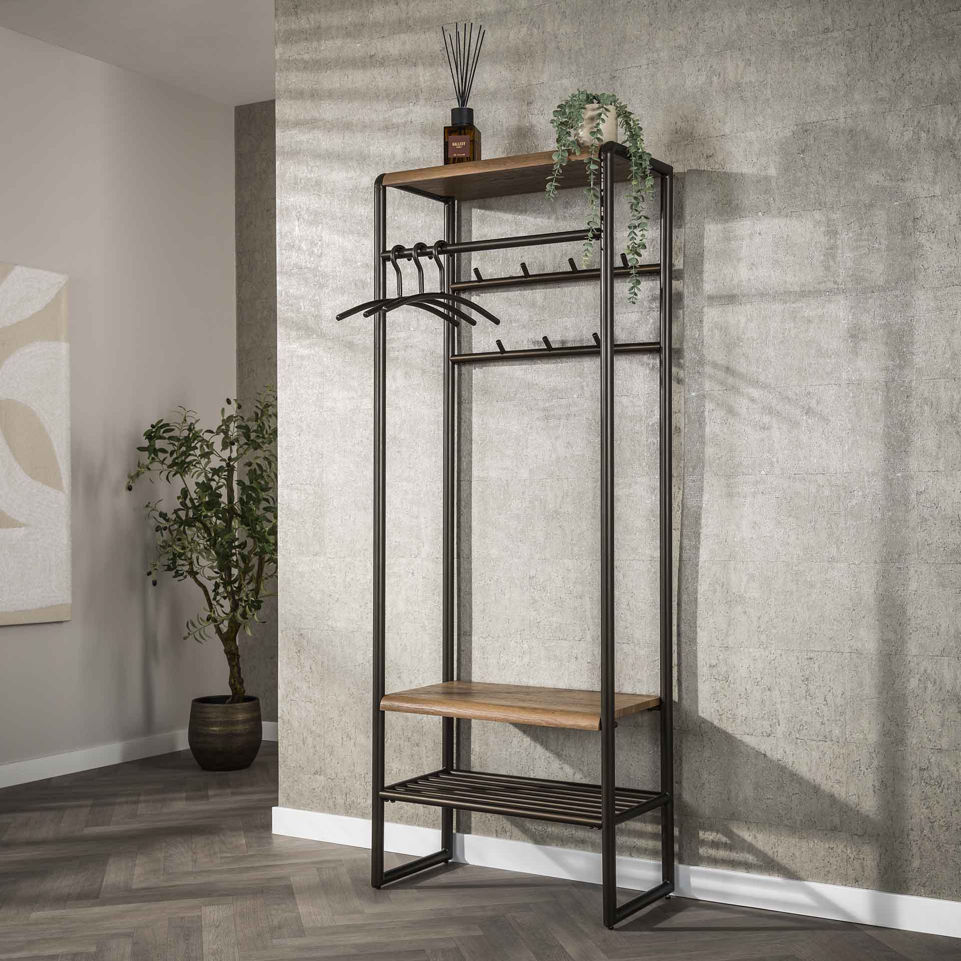 Het Senna garderobemeubel is een compacte en stijlvolle oplossing om jassen, tassen en schoenen netjes te organiseren. Met een robuuste drift brown afwerking past dit meubel perfect in een moderne of industriële hal. Het meubel biedt voldoende opbergruimte zonder veel vloeroppervlak in te nemen en is gemaakt met aandacht voor stabiliteit en een nette uitstraling.