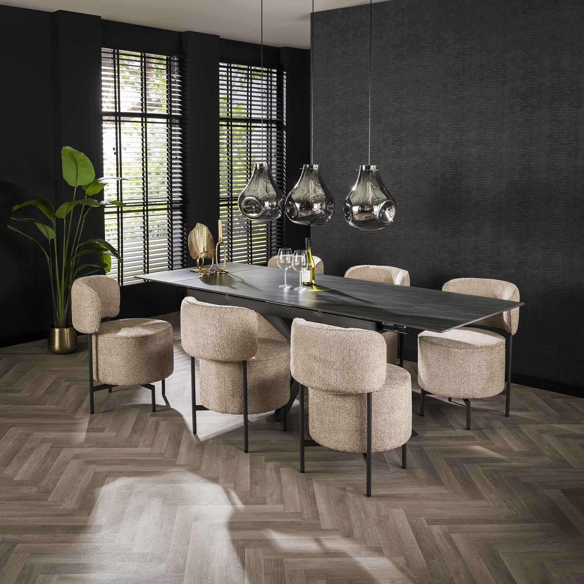 De Dante Bouclé eetkamerstoelen combineren comfort met een actuele uitstraling. Door de neutrale zandkleur passen ze in veel kleurpaletten en interieurstijlen. Ideaal als set voor mensen die op zoek zijn naar een warme, gezellige sfeer aan tafel zonder in te leveren op functionaliteit.