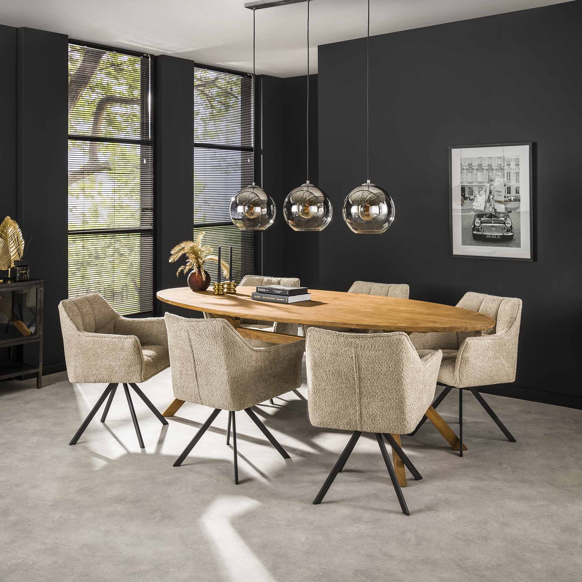 Deze set van 2 eetkamerstoelen Lino in bouclé stof biedt een sfeervolle en comfortabele zitoplossing voor moderne interieurs. De warme zandkleur en de zachte bouclé-vezel geven een luxe, uitnodigende uitstraling, terwijl het draaibare onderstel gebruiksgemak toevoegt tijdens het zitten en opstaan. Ideaal voor eetkamers, open keukens en werkplekken waar comfort en uitstraling hand in hand gaan.
