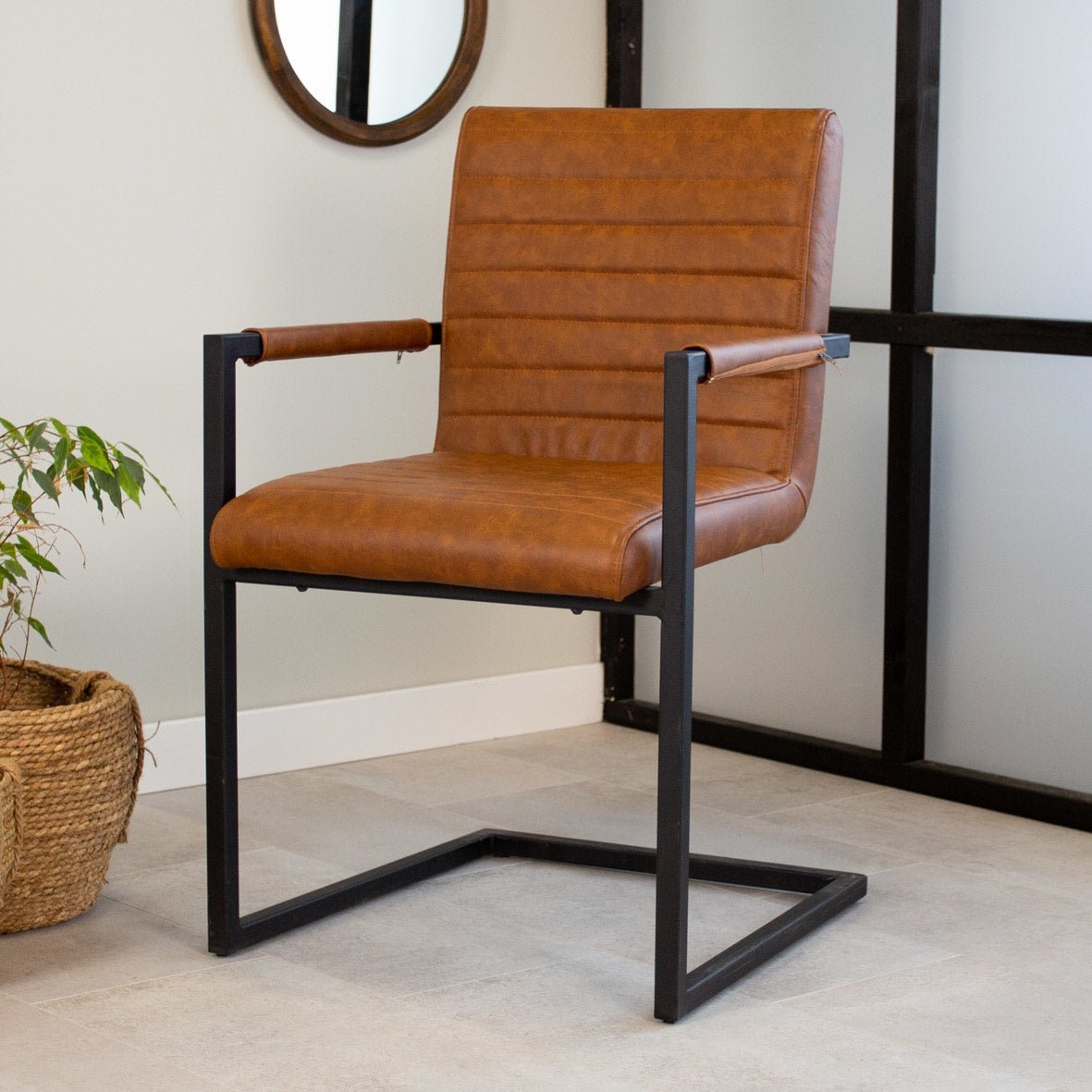 De industriële eetkamerstoel Kuba cognac is de perfecte toevoeging aan een stoer interieur. Met zijn stoere zitting met horizontale naden en zwart gepoedercoat frame de ideale musthave in je interieur!
