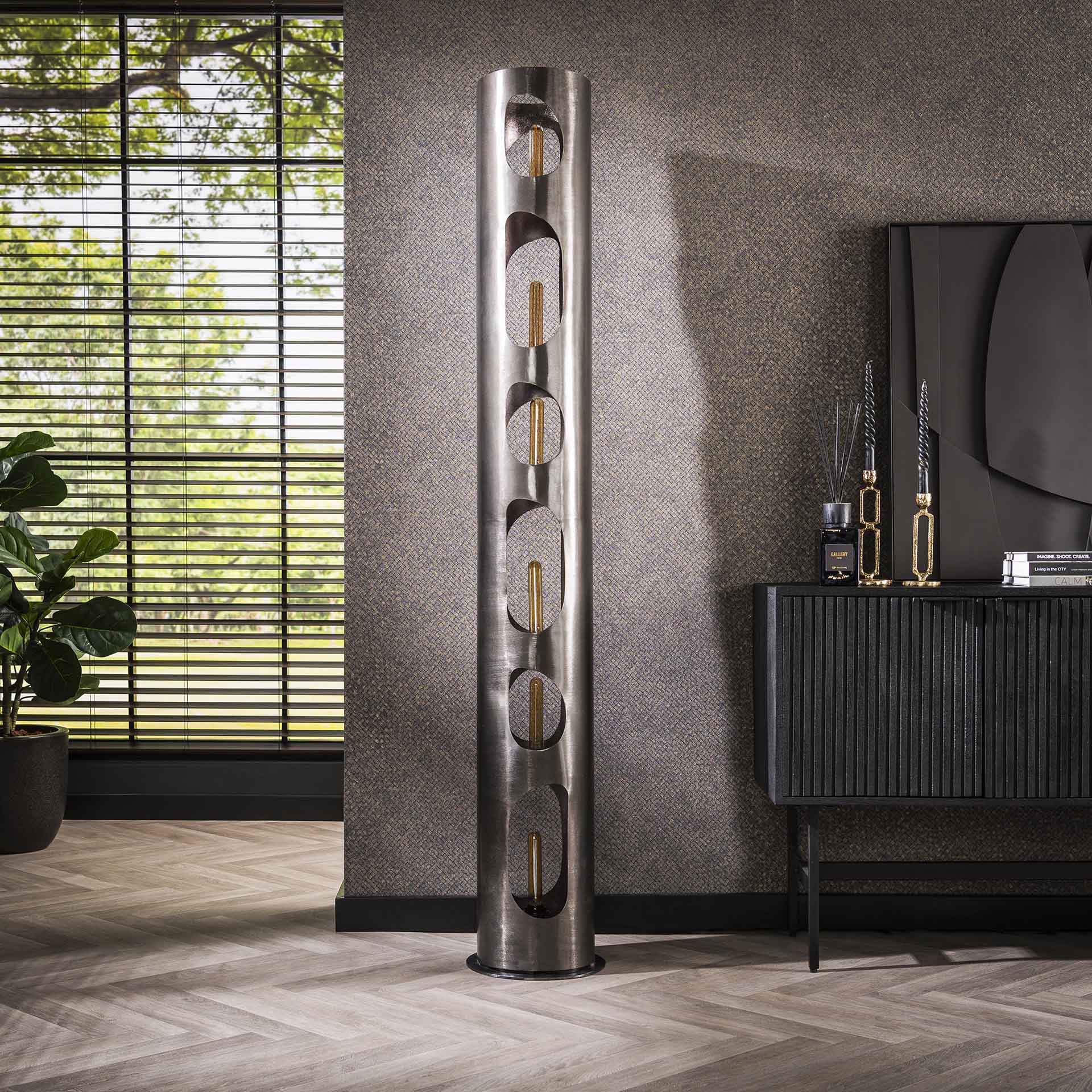 Met een hoogte van 212 cm en een diameter van 30 cm is deze vloerlamp compact genoeg om in kleinere ruimtes te plaatsen, maar groot genoeg om een opvallend element te zijn. De slanke voet zorgt ervoor dat de lamp stabiel staat zonder te veel oppervlak in beslag te nemen.