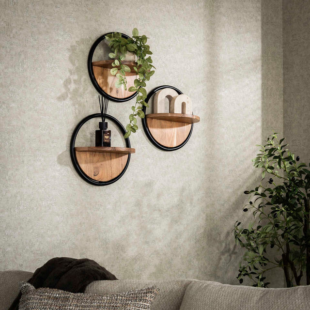 Deze set van 3 ronde wandplanken is gemaakt van massief acaciahout en brengt direct warmte en karakter in huis. De compacte Ø35 cm planken zijn ideaal voor het presenteren van decoratie, planten of kleine boeken en passen moeiteloos in allerlei interieurstijlen. Omdat het om een set gaat, creëer je eenvoudig een samenhangende wandopstelling of speels trio.