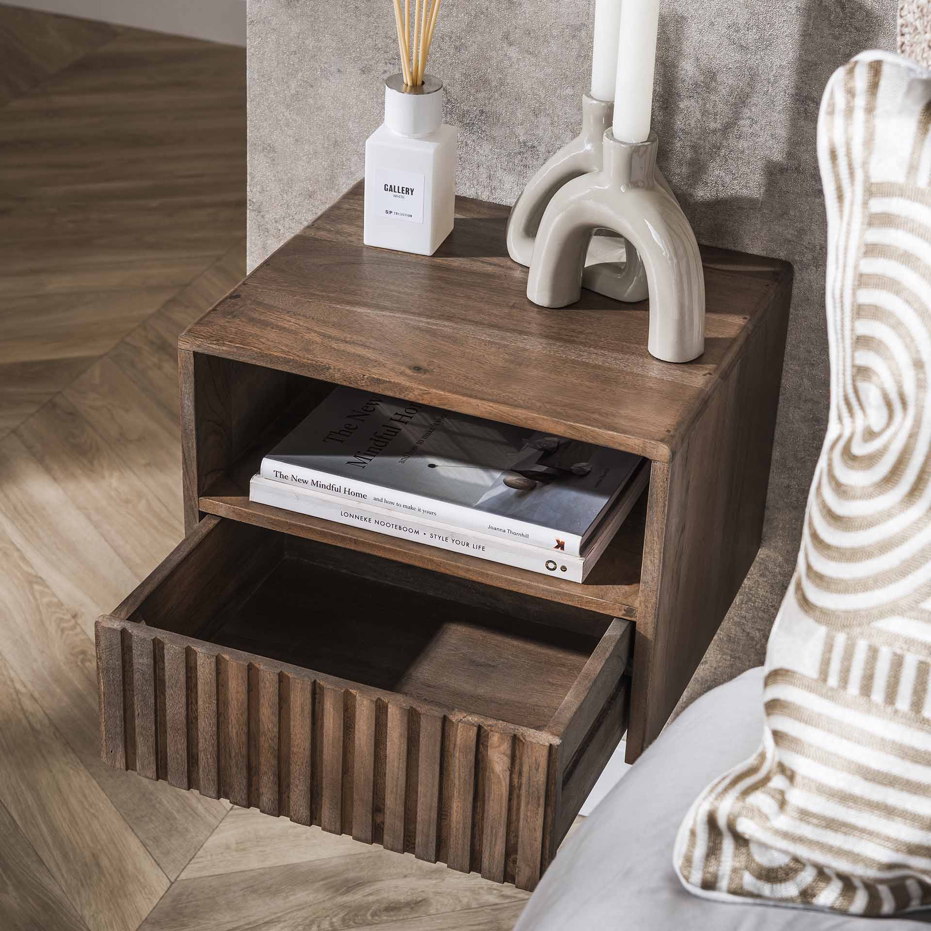 Geef je slaapkamer een opgeruimde, warme look met dit zwevende nachtkastje van massief acaciahout in stijlvolle drift brown. Het compacte ontwerp combineert een open vak voor je boek of bril met een praktische lade voor kleine essentials. Door de zwevende montage oogt de vloer ruimtelijk en maak je eenvoudig schoon onder het kastje.