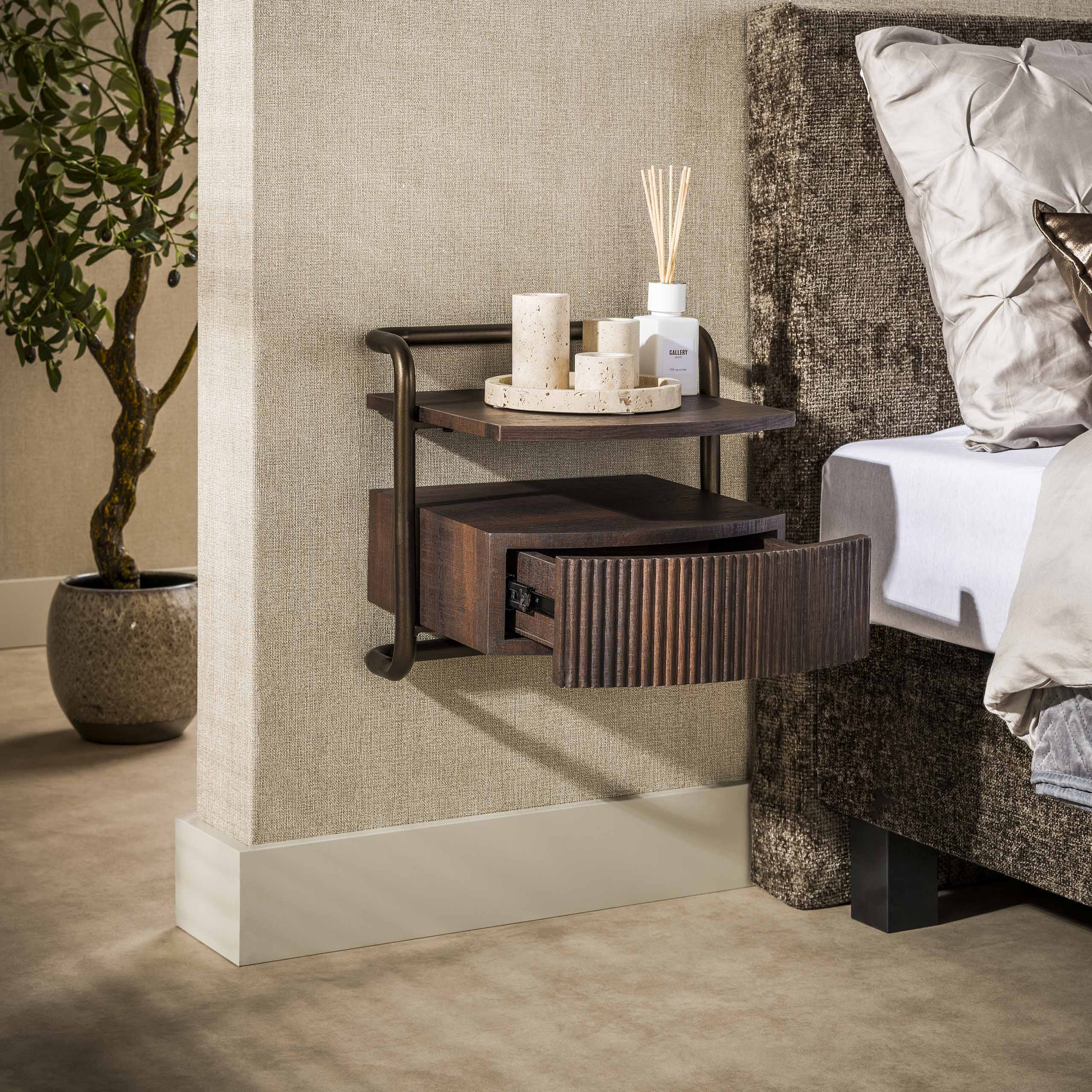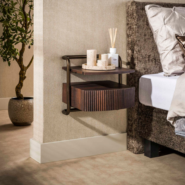 Zwevend nachtkastje met 1 lade donkerbruin hout brons frame Blaze